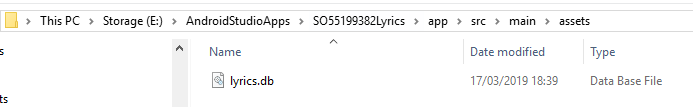 03-17 19:49:11.275 16136-16136/? D/DBPATH: DB Path is /data/data/com.example.so55199382lyrics/databases/lyrics.db