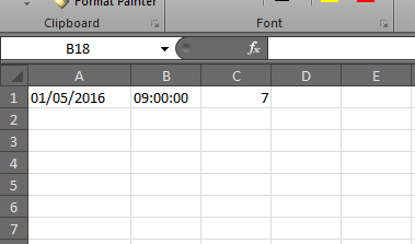 ["01/05/2016", "09:00:00", 7]进入第5行,A、B、C列