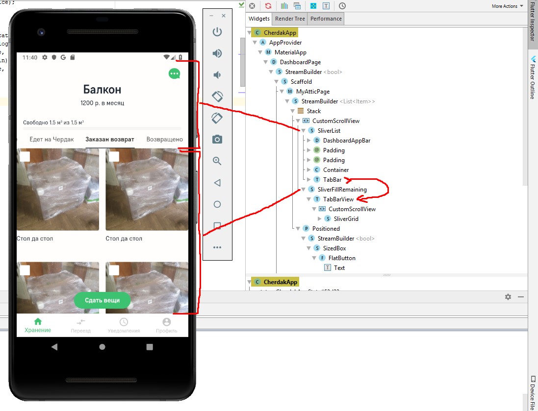 我有小部件树,它包含顶级的CustomScrollView和SliverFillRemaining。SliverFillRemaining可能包含另一个CustomScrollView (见图)。