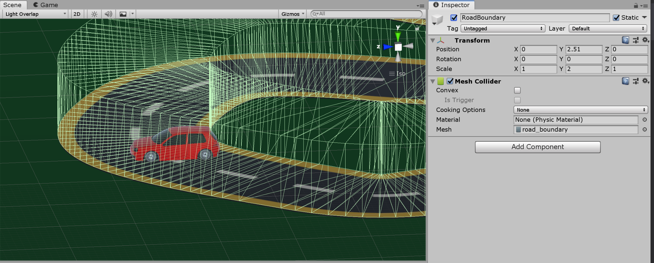 因此,我在路上创建了一个网格对撞机,以便在OnCollisionEnter()中检测碰撞。