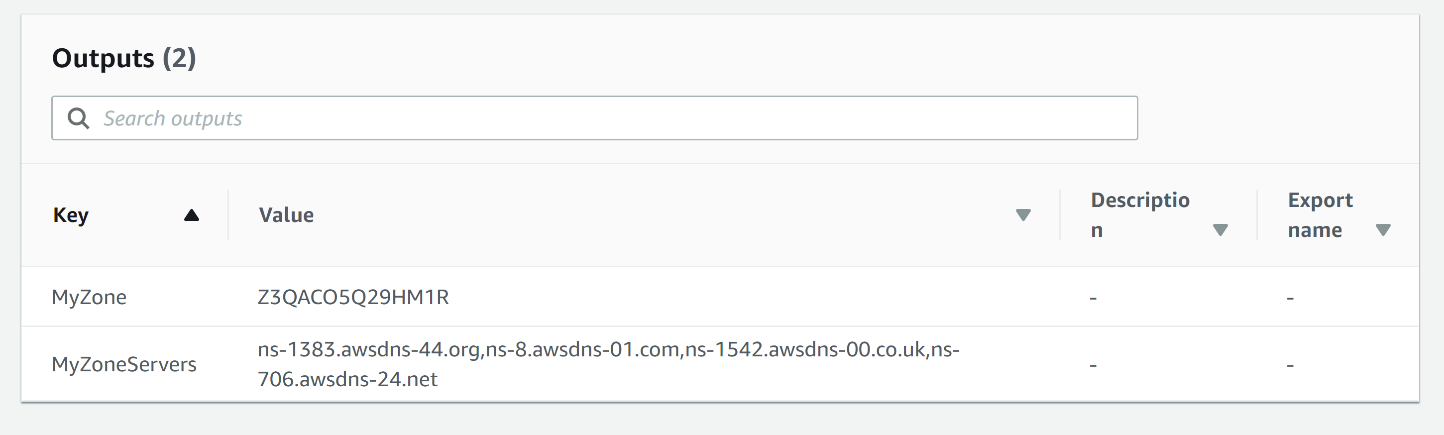 Value: !Join [',', !GetAtt MyZone.NameServers] # or any other delimiter that suits you您应该看到以下输出: