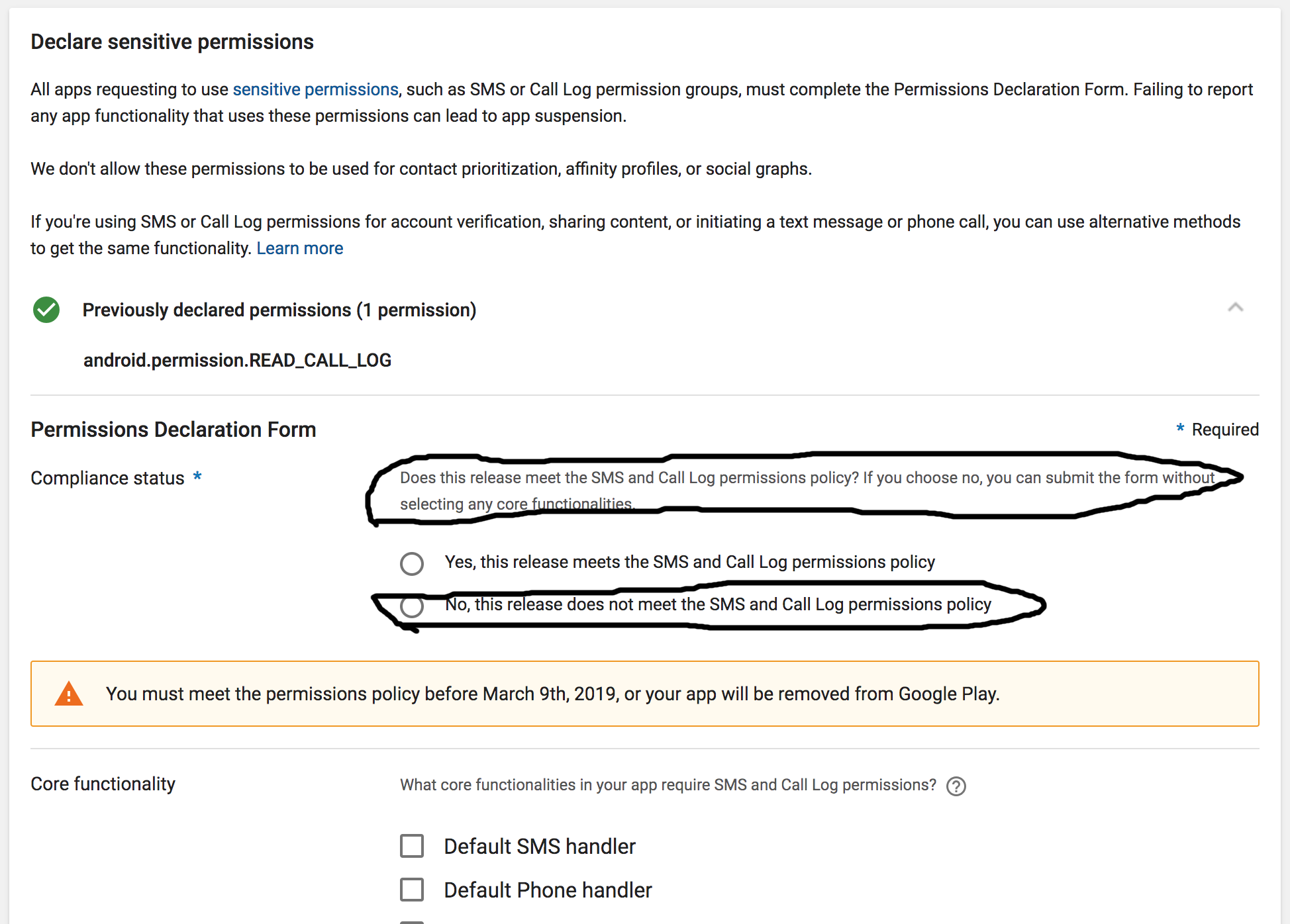 在2019年3月9日之后,No的选项,此版本不符合SMS和呼叫日志权限策略已经消失,我们停留在声明表单中,在我们删除敏感权限列表后并不完全需要它。