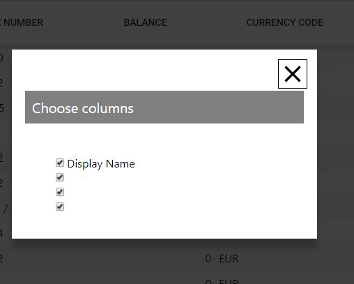 当用户单击“选择列”选项时,会出现带有复选框选项的模式,用户可以在其中选择要显示或隐藏的列。
