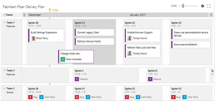 交付计划也是互动的。您可以通过将工作项拖到一个新的sprint中来更改指定的sprint,如上面的图像所示。