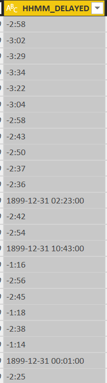 我正在尝试将该列格式化为PowerBI中的数据类型“持续时间”。为此,我需要删除数据加载后出现的YYYY DD。我猜想这些不一致是由于某些值是以这种格式存在的:-3:34,而订单是在10:43:00