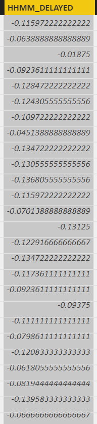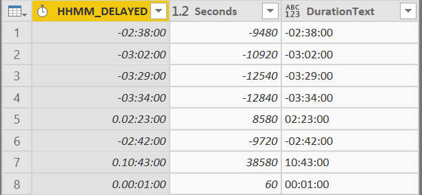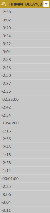 #"Changed Type" = Table.TransformColumnTypes(#"Promoted Headers",{{"HHMM_DELAYED", type duration}}),