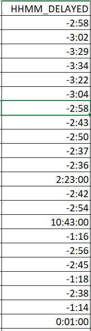 我预计结果是-02:03,03:01。负值表示提前交付,正值表示延迟交付。如2h,3分钟或3h,1分钟。列需要以某种形式的时间数据类型,因为我计划做计算等。