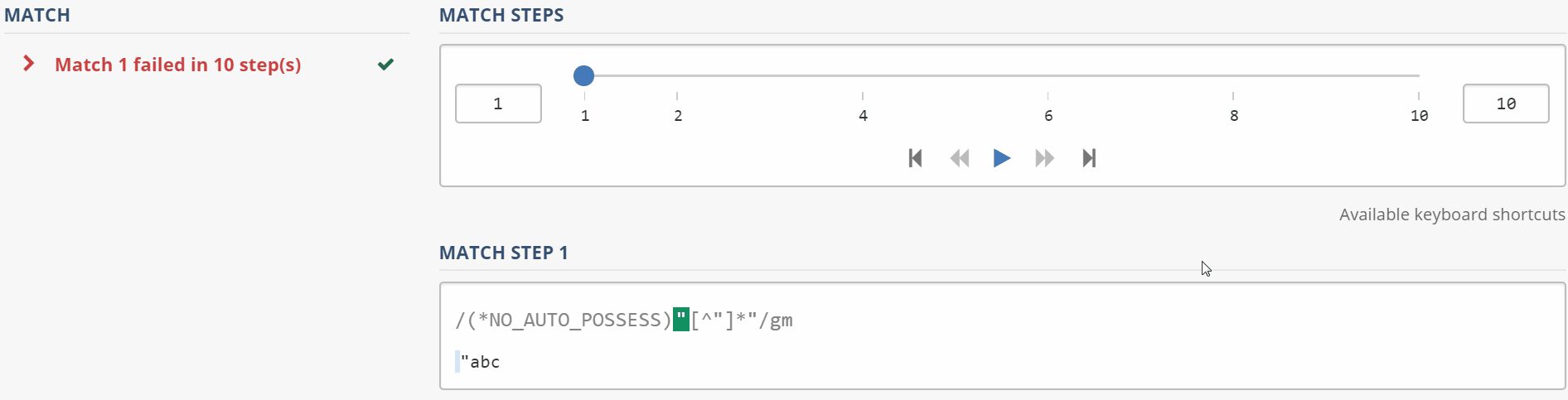 我需要提到的是,".*"回溯,如果你检查引擎的步骤,你会发现它开始一个一个地给字符,但有问题的一个没有。为什么这个区别,虽然.*和[^"]*都是贪婪的量词匹配相同的文本,但一个必须后退,另一个没有。