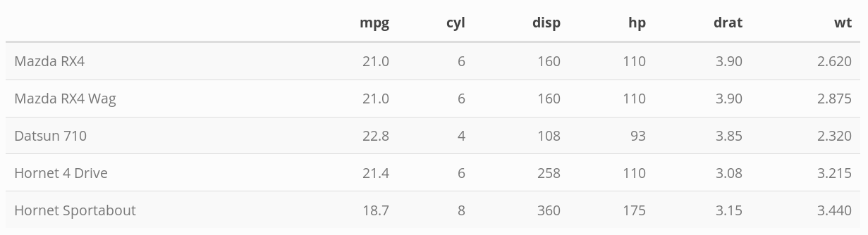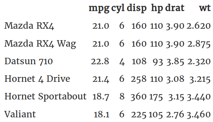 kable(head(mtcars) %>%