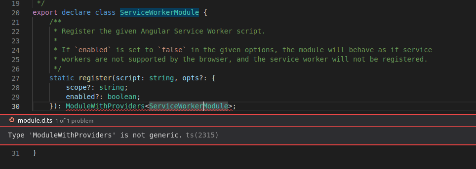 ./node_modules/@angular/service-worker/src/module.d.ts (30,9)中的错误:输入“ModuleWithProviders”不是泛型的。