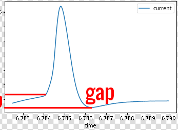 df1.plot(x='time', y='current')我想用导数的变化来找出第一个兴趣点(x1,y1),然后再找下点(x2,y2),但看起来很复杂。如果有人给我一些提示或程序,我会很感激的。数据集如下,