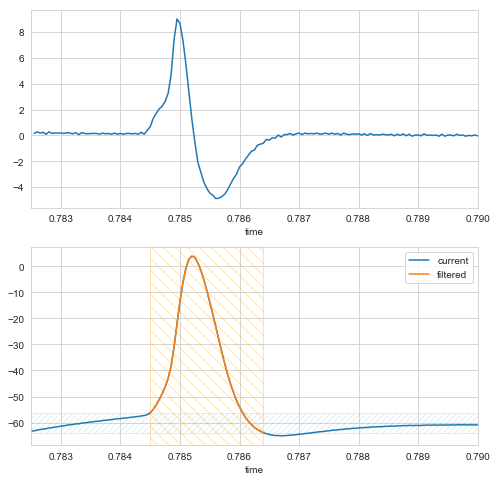 我们可以绘制连续点之间的current差值(本质上是导数的常数因子,因为times是均匀间隔的)。第一个图表显示了实际的diff,在此基础上我们可以设置一些阈值,比如0.3,并应用它来过滤主DataFrame。过滤后的值在第二个图表中以橙色显示: