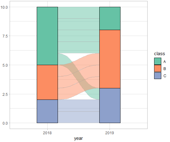 我在以合适的格式获取数据时遇到了问题,无法用g冲积层制作冲积图(每冲积层一行)。我想绘制2018年至2019年不同类别之间的流动图。