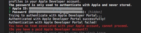 试图与苹果开发者门户认证..。 成功通过Apple Developer Portal认证! 与Apple Developer Portal的身份验证失败! 您没有与您的苹果帐户相关的团队,无法继续。 (你有一个付费的苹果开发者账户吗?)