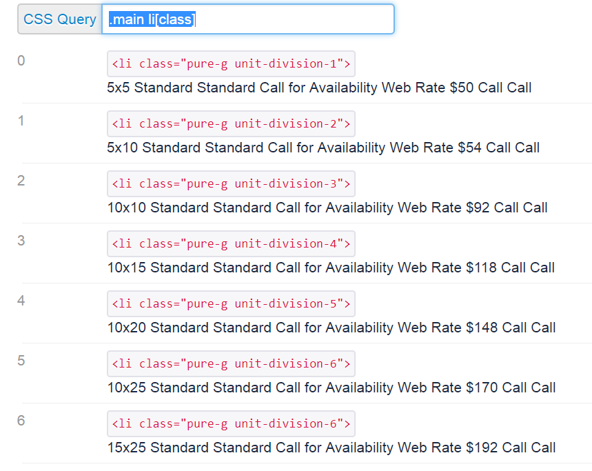 假设没有从给定的url重定向。在这里,我使用:n个类型的伪类选择器来针对清单的每一行。这些行是保存每个框列表的信息的li (list)元素。我构建了一个css选择器字符串,该字符串指定行,然后指定我所要查找的行中的元素。我将该字符串传递给querySelector,或返回匹配元素/s的querySelectorAll。