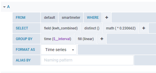 SELECT distinct("kwh_combined") * 0.230662 FROM "smartmeter" WHERE $timeFilter GROUP BY time($__interval) fill(linear)2)如何回填数据?(从日志记录开始就将这些电价写入数据库,并将其添加到当时的测量中)