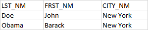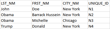 大:df = pd.DataFrame([['Doe','John','New York', 'N1'], ['Obama', 'Barack Hussein', 'New York', 'N2'], ['Obama', 'Michelle', 'Chicago', 'N3'], ['Trump', 'Donald', 'New York', 'N4']], columns = ['FRST_NM', 'LST_NM', 'CITY_NM', 'UNIQUE_ID'])