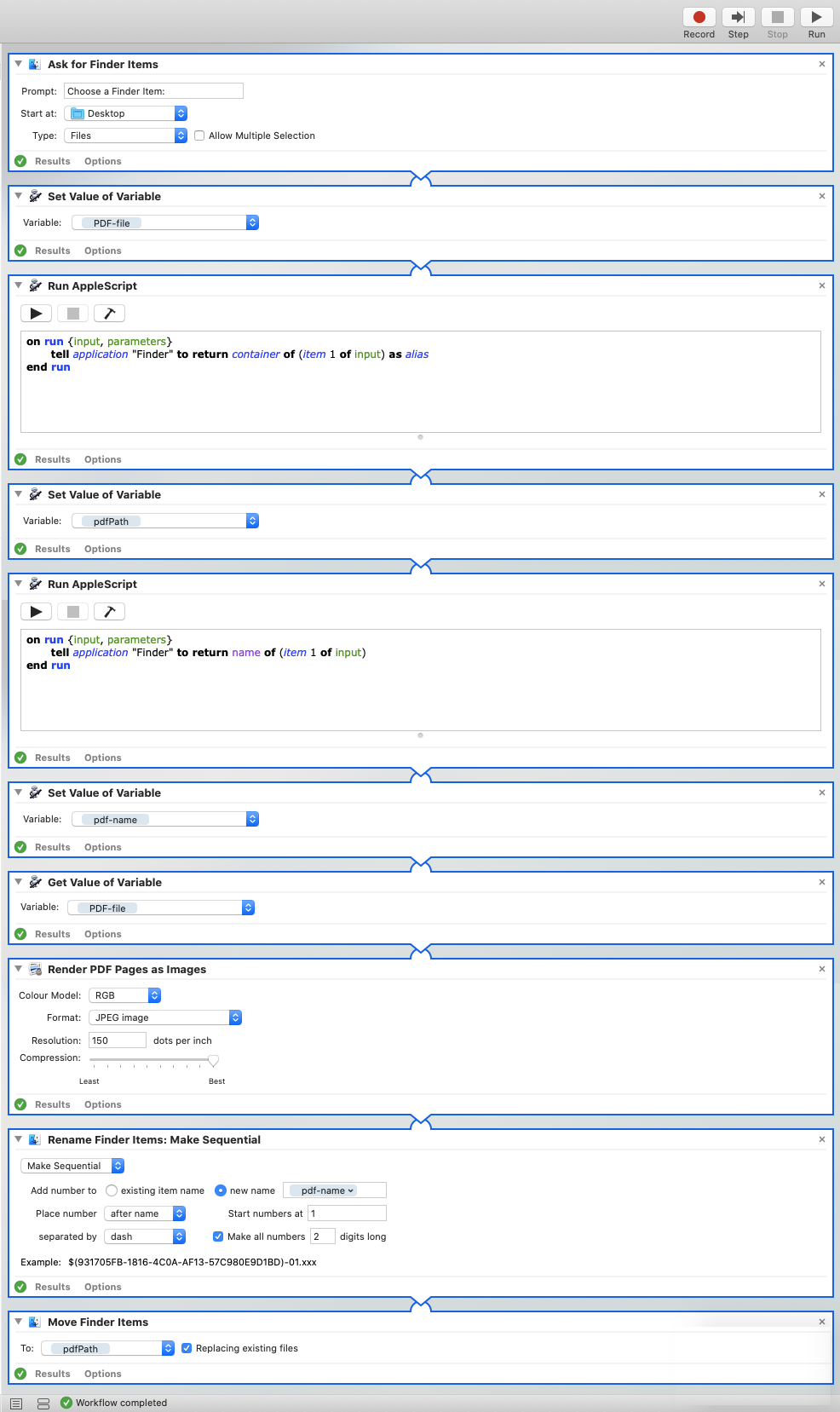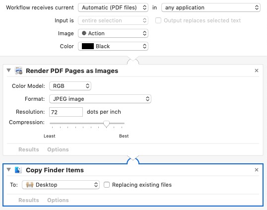 我发现将文件保存到特定文件夹很容易;例如,下面的工作流将图像从pdf保存到桌面: