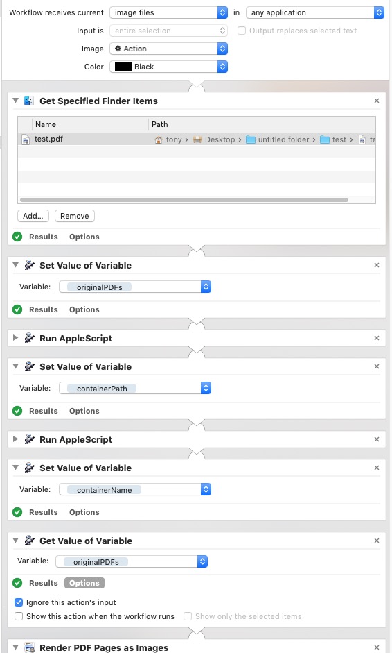 这有点令人费解,因为Automator没有获取名称或路径的默认操作(这是我在过去的第一次操作之一),您需要在将项目放入变量时对内容进行洗牌,并且工作流将多个输入项作为单个批处理。