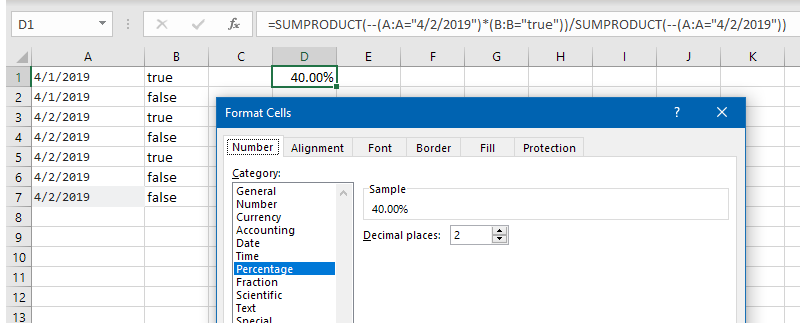 =SUMPRODUCT(--(A:A="4/2/2019")*(B:B="true"))/SUMPRODUCT(--(A:A="4/2/2019"))
