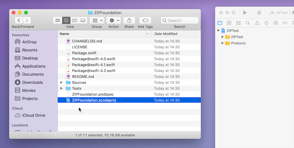 Zipfoundation导入到文件夹中,没有问题。主要的区别在于,ZipFoundation提到必须通过将ZIPFoundation.xcodeproj拖到Xcode的project来将获取的项目集成到您的工作区中。