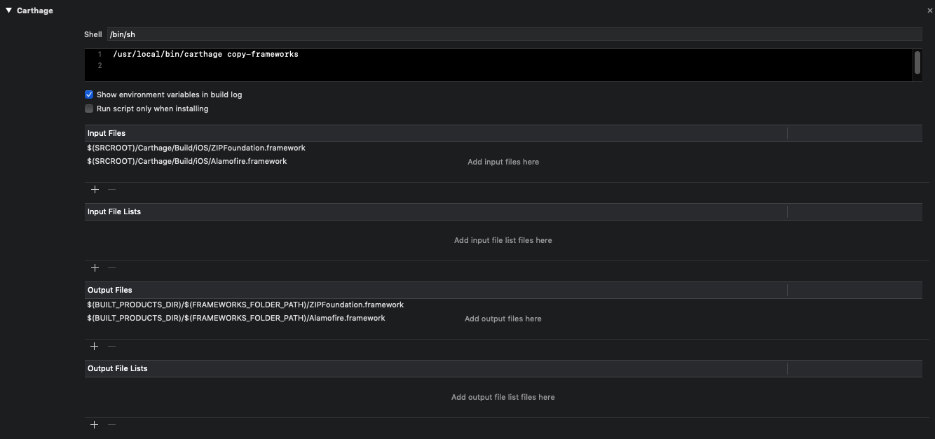 当您将与上述方法集成时,您也不需要的“复制框架”脚本。当您使用--no-build选项时,Carthage文件夹将不包含二进制框架。
