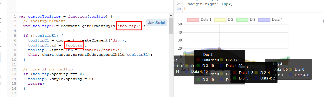 我能接近这个问题的是,如果您有一个不同的id --在这种情况下,chart.js将在每次尝试呈现一个工具提示时创建一个新的工具提示。下面是一个示例:
