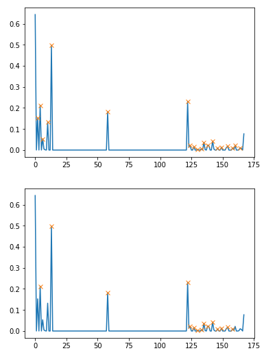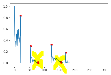 使用@jojo的答案,并选择适当的参数(dy_lim = 0.1和di_lim = 10 ),结果是接近的,但是添加了一些不应该是峰值的点。