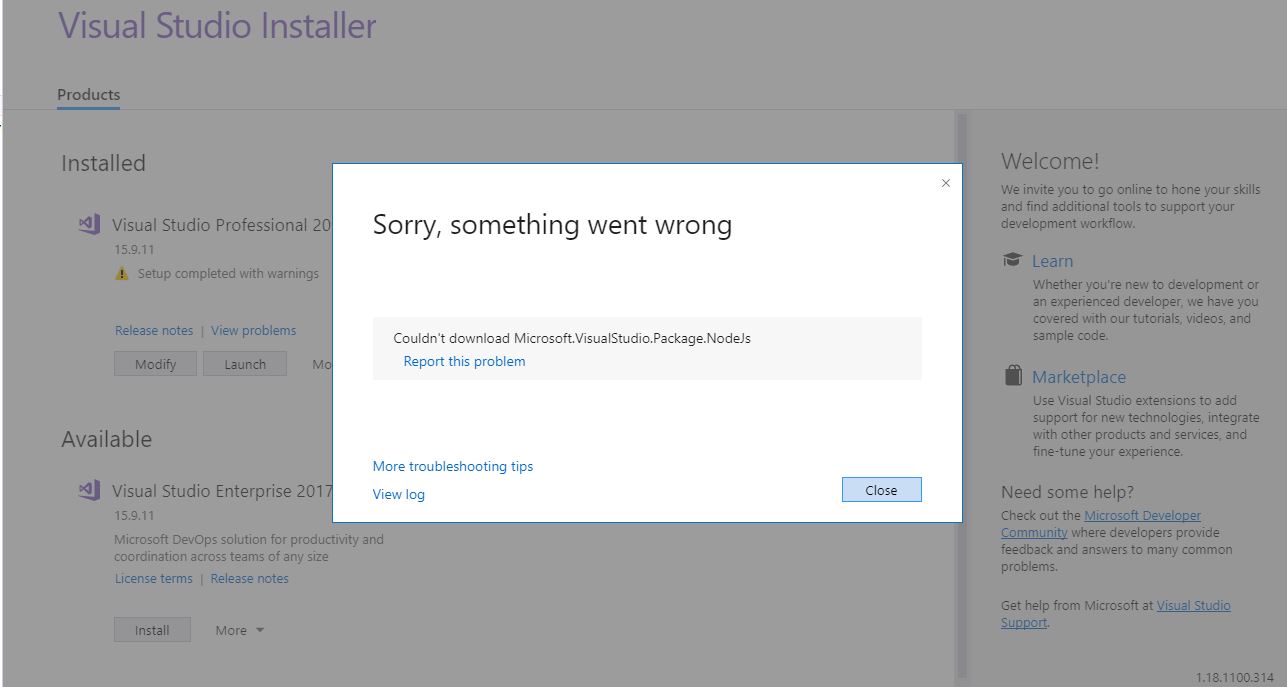 9ca81c7b2f40/63f589ed1fc2af6675dc554745f44005/microsoft.visualstudio.package.nodejs.vsix'.搜索URL https://aka.ms/VSSetupErrorReports?q=PackageId=Microsoft.VisualStudio.Package.NodeJs;PackageAction=DownloadPackage;ReturnCode=0x80072eff详细信息WebClient下载失败:无法从传输连接读取数据:现有连接被远程主机强制关闭。位下载失败:文件找不到。(Microsoft.VisualStudio.Workload.ManagedDesktop,WinInet下载失败:功能: InternetReadFile,HR:-2147012865,消息:未知错误12031影响工作负载.NET桌面开发version=15.8.27906.1) ASP.NET和web开发(Microsoft.VisualStudio.Workload.NetWeb,version=15.8.27906.1)影响组件ASP.NET和web开发工具(Microsoft.VisualStudio.Component.Web,version=15.8.27825.0) ASP.NET和web开发工具先决条件(Microsoft.VisualStudio.ComponentGroup.Web,(用于web开发的云工具(Microsoft.VisualStudio.ComponentGroup.Web.CloudTools,version=15.8.27729.1) JavaScript和TypeScript语言支持(Microsoft.VisualStudio.Component.JavaScript.TypeScript,version=15.9.28125.51) JavaScript诊断( (Microsoft.VisualStudio.Component.JavaScript.Diagnostics,version=15.8.27729.1) Microsoft Azure WebJobs Tools (Component.Microsoft.VisualStudio.Web.AzureFunctions,(微软Azure WebJobs Tools (Microsoft.VisualStudio.Component.Wcf.Tooling,version=15.7.27617.1) TypeScript 3.1SDK version=15.7.27617.1 version=15.0.28218.60( Windows通信基金会(Microsoft.VisualStudio.Component.Wcf.Tooling,version=15.8.27924.0)