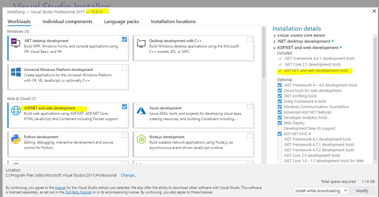尽管我选择了以下所需的工作负载,但获得安装缺失功能的错误