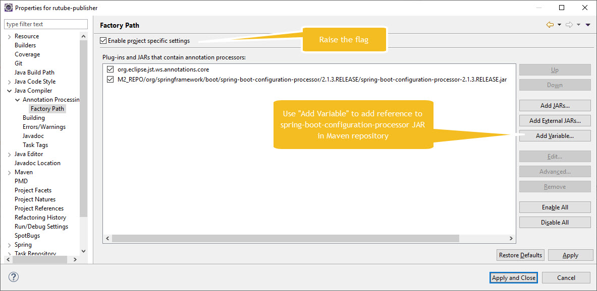 有必要为Eclipse项目启用注释处理并注册处理器:
