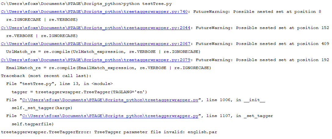 把它加到小路上..。我尽我所能,但我总是犯这个错误。我试图将english.par放置在多个路径中,但仍然没有工作。我尝试了*TreeTagger*、TreeTagger\lib以及我的脚本所在的位置。我没主意了,我解决不了。你知道问题出在哪里吗?