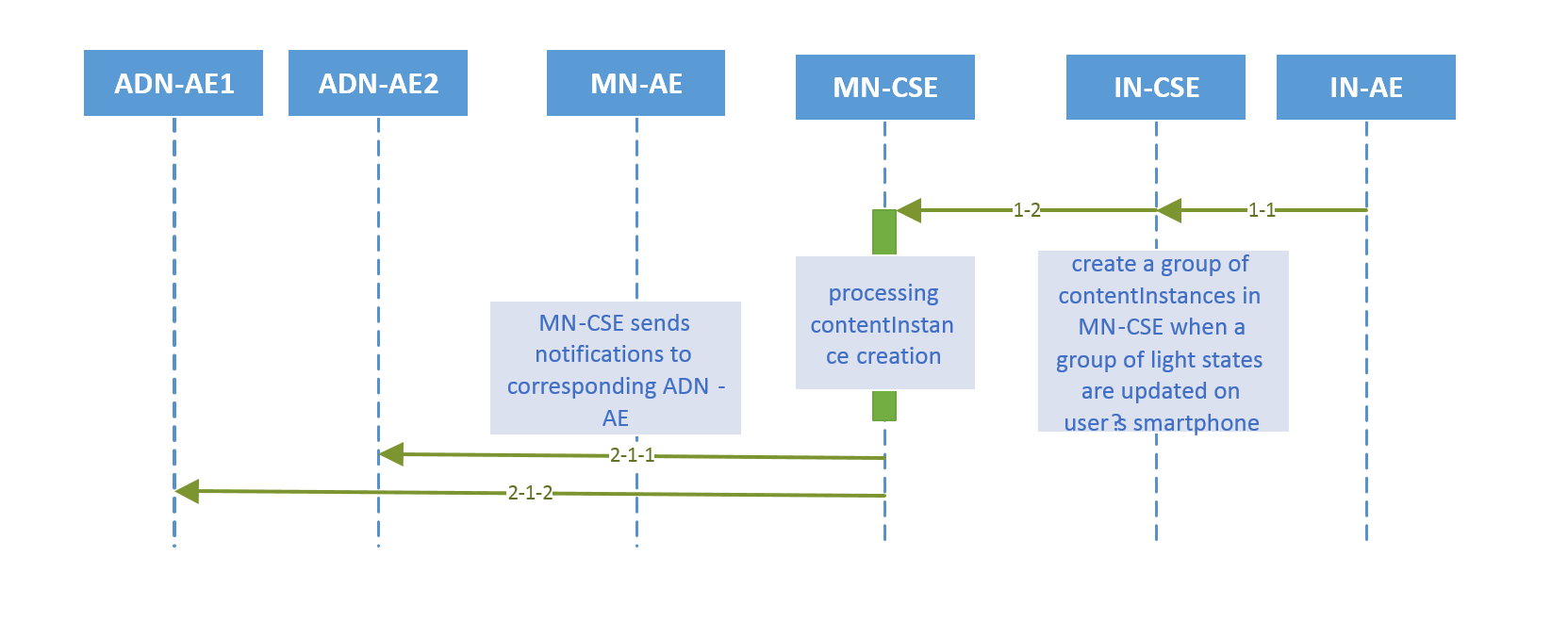 用于多个光控制的调用流如下图所示,并按以下顺序排列: 当用户在她/他的智能手机上更新一组光状态时,IN-AE创建了一个新的contentInstance,目标是承载在MN上的一组light容器资源。这里显示的请求 对于每个成功创建的contentInstances,MN向相应的Light发送一个通知.