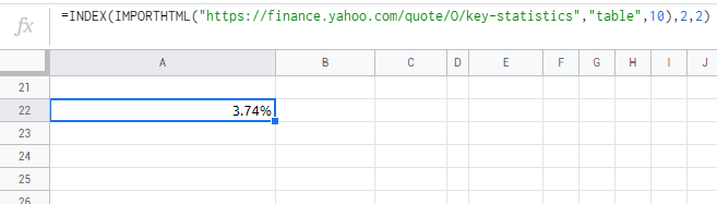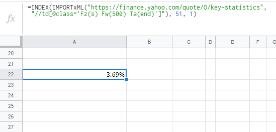 =INDEX(IMPORTHTML("https://finance.yahoo.com/quote/O/key-statistics", "table", 10), 2, 2)