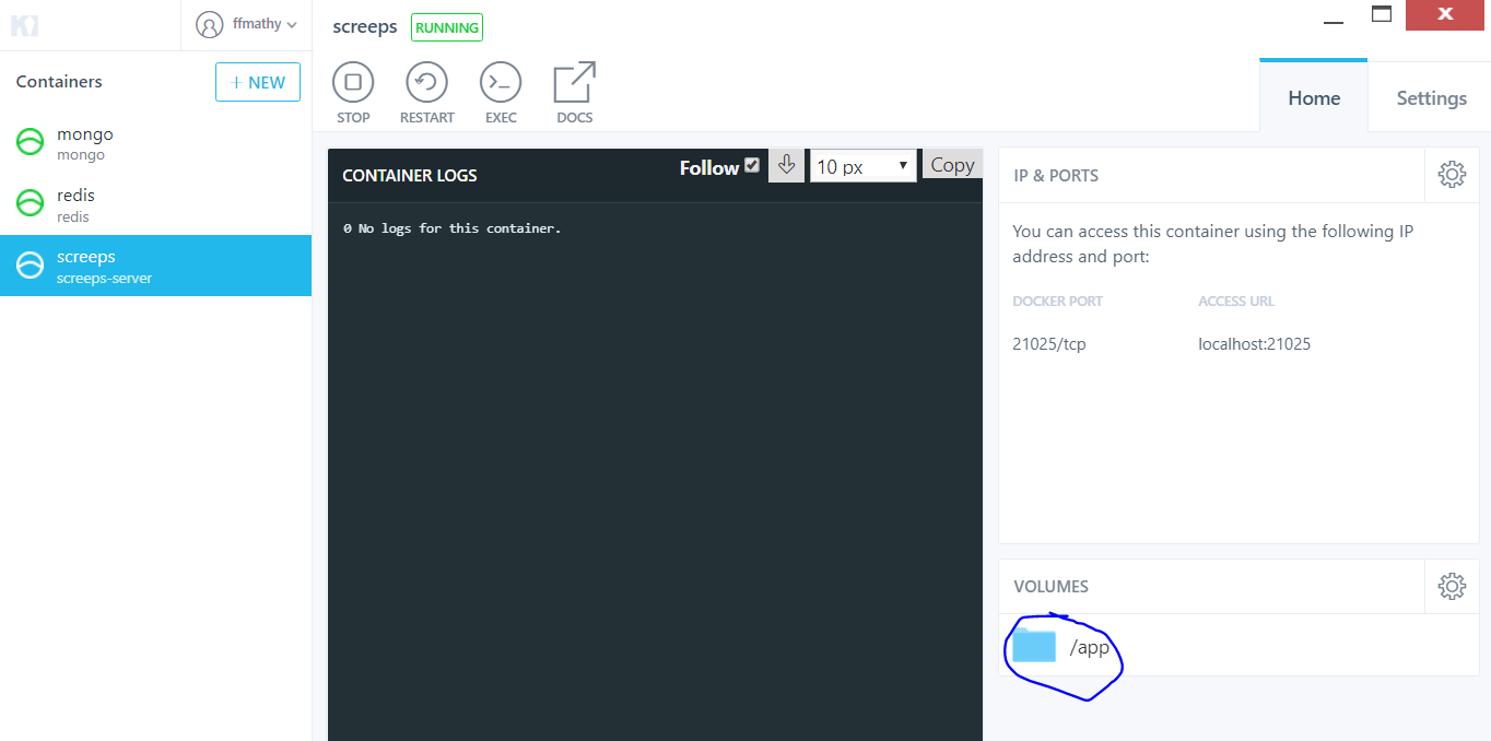 当我尝试使用docker-compose up启动我的容器时,它们看起来很好。但是,screeps容器没有在日志中显示任何内容,也没有启动(我知道这一点,因为我无法连接到它的端口)。
