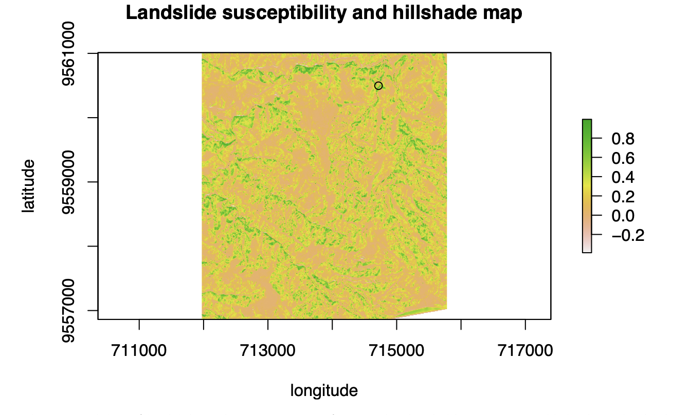 plot(overlay_map, main = "Landslide susceptibility and hillshade map",