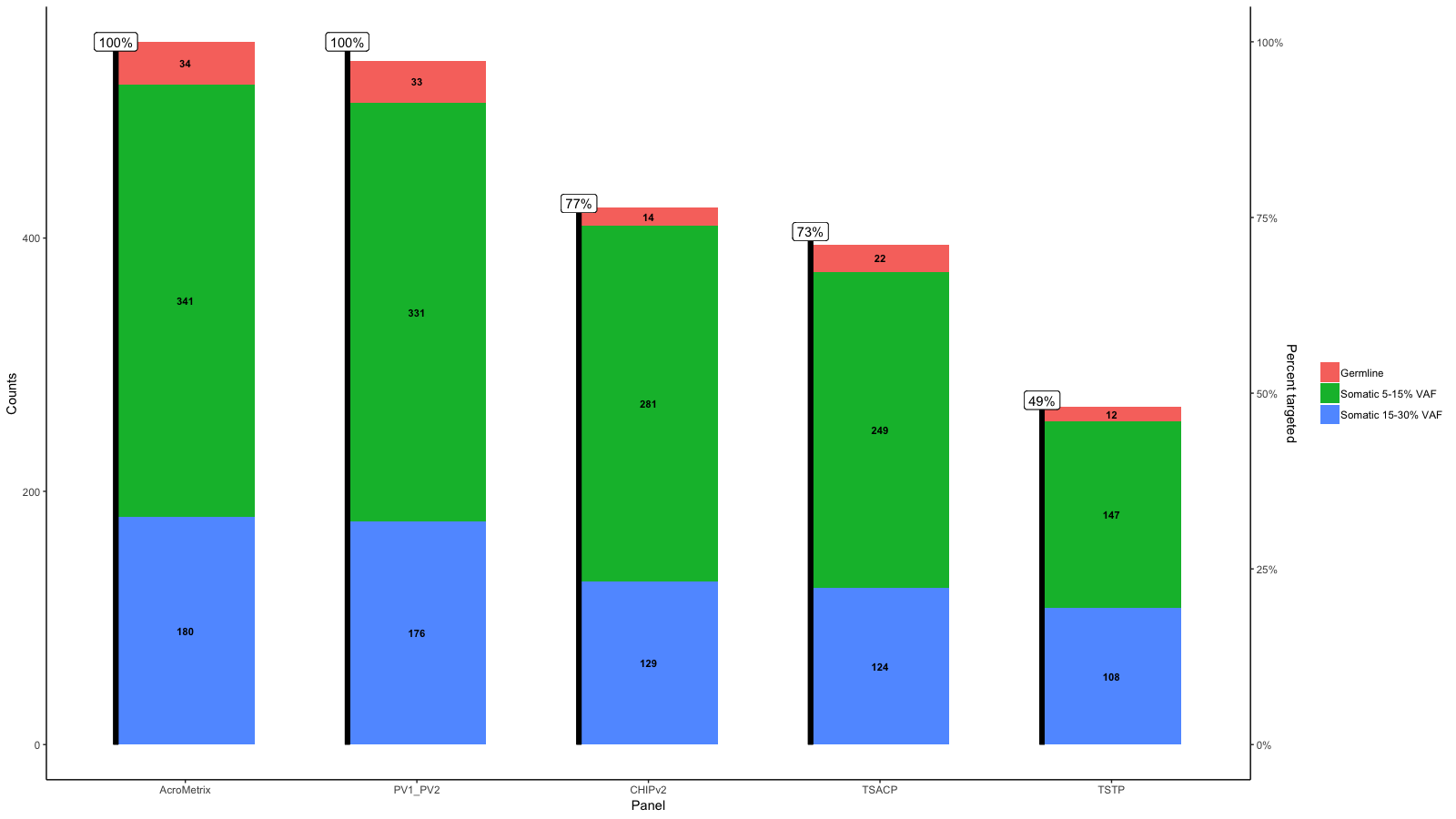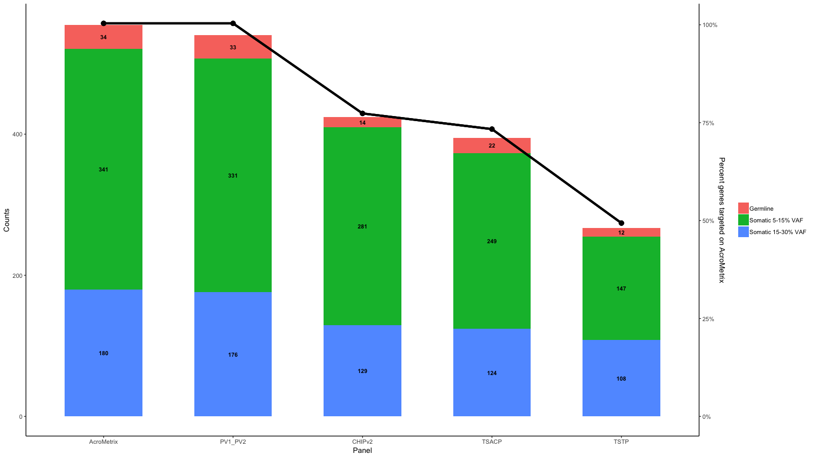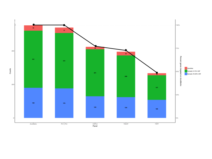 我比较了四个目标基因面板在一个标准(AcroMetrix)中检测突变的能力。突变是不同的类型和频率,我可以很容易地产生一个条形图。然而,这些面板并不是针对AcroMetrix中的所有突变。因此,我想增加一个百分比的目标基线,在右手边有一个伴随的y轴。