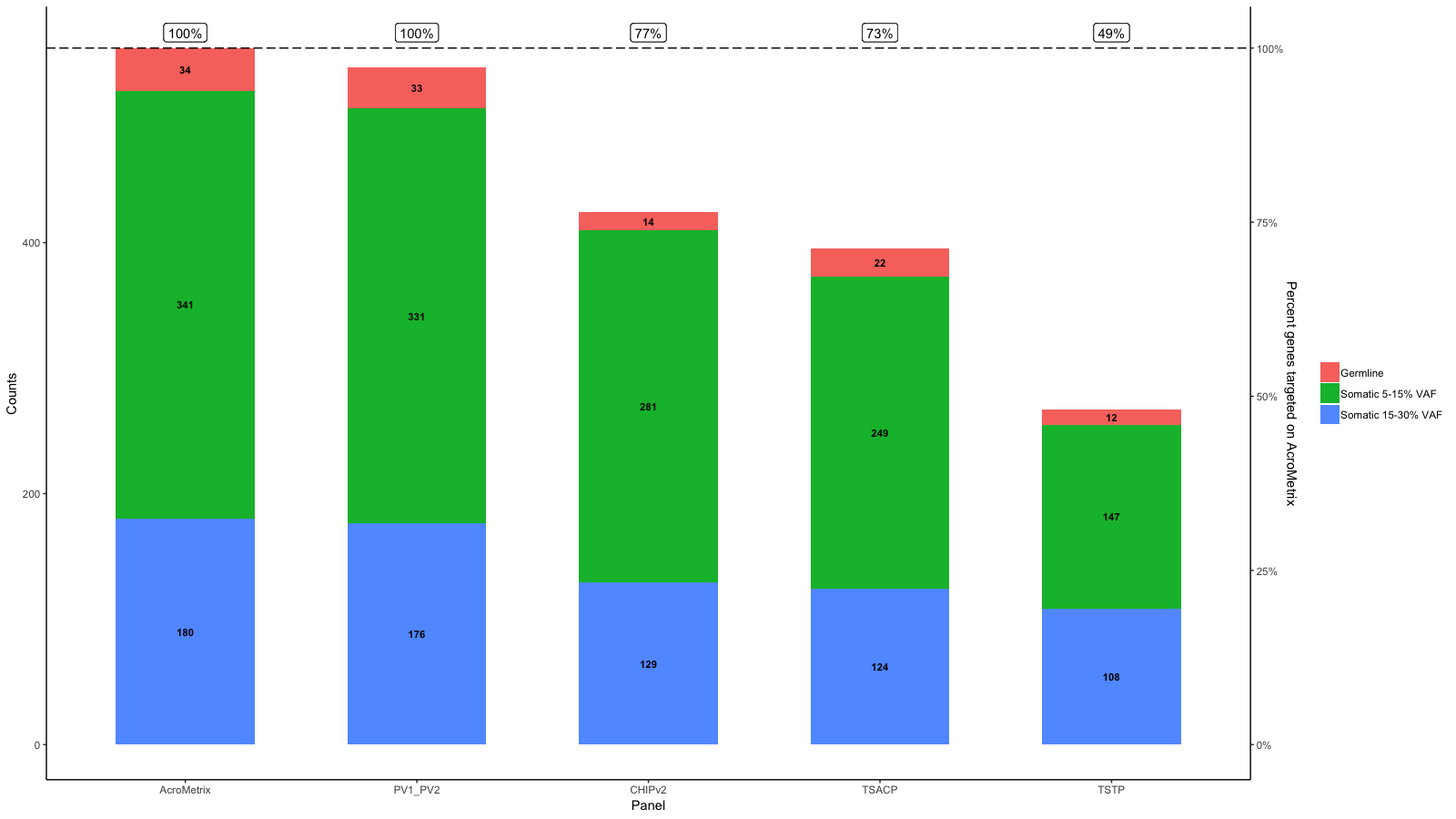 df<-data.frame(row.names=c("AcroMetrix","PV1_PV2","CHIPv2","TSACP","TSTP"),Germline=c(34,33,14,22,12),Somatic_5_15=c(341,331,281,249,147),Somatic_15_30=c(180,176,129,124,108))