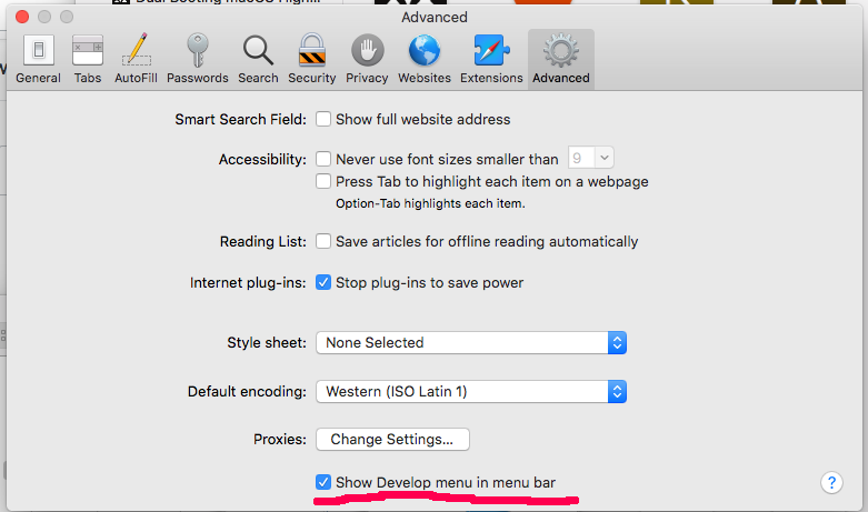 Webinspector USB,则只需要启用选项。您不需要在模拟器设备上标记此选项。我和在模拟器上没有能够运行网络巡查员。Show develop menu in menu bar在菜单栏中启用Develop。如果在菜单栏中看不到" develop“,请转到菜单栏并单击"Safari > Preferences > Advanced”并选择“显示菜单栏中的发展菜单”复选框。