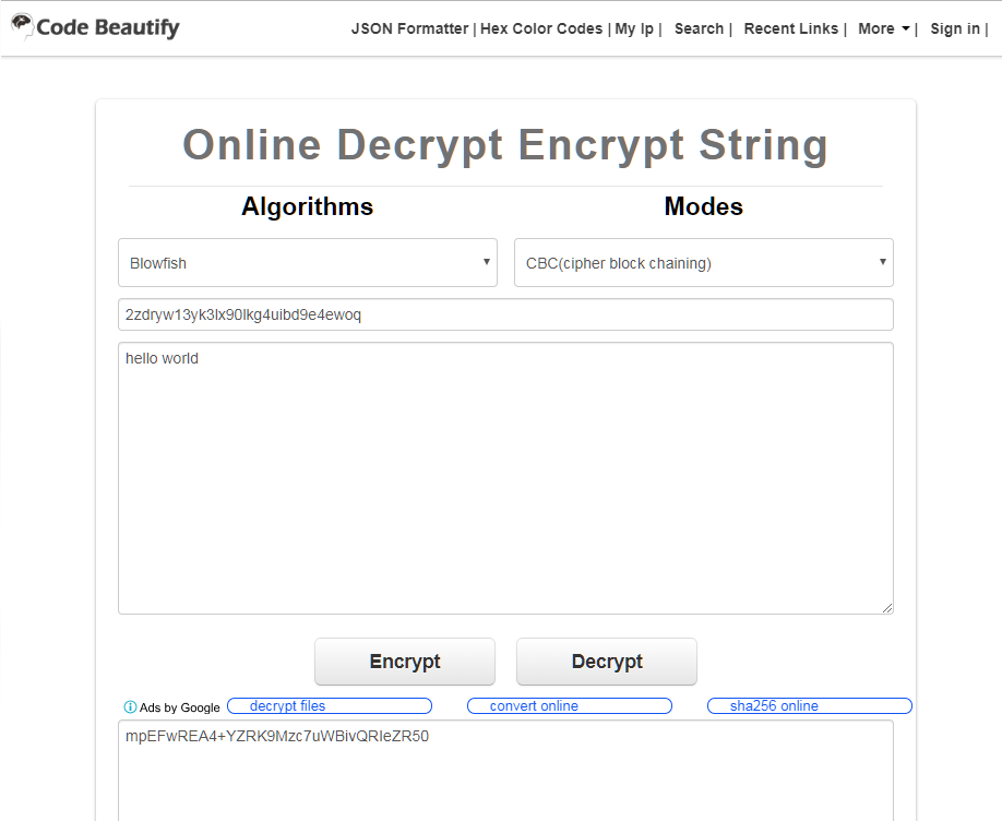 // This is what I get from codebeautify site, encrypting Hello with key123