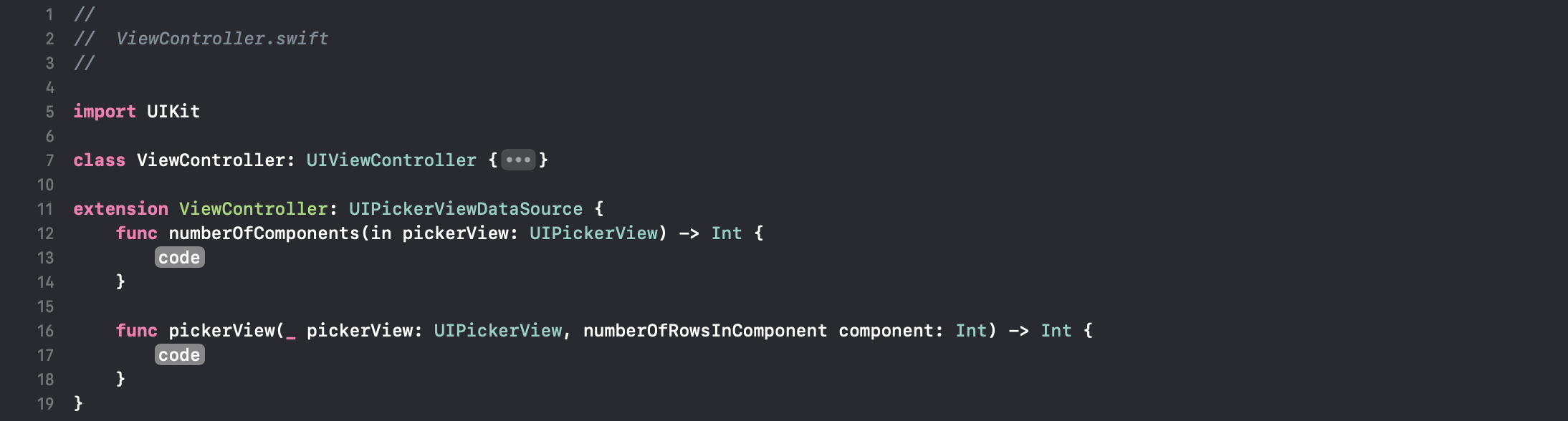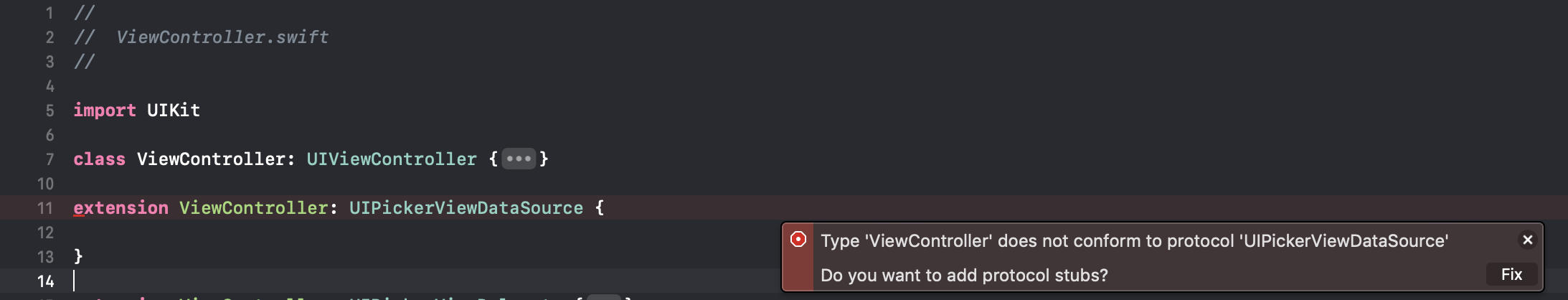 如果选择“fix”选项,它将添加缺少的必需UIPickerViewDataSource委托方法: