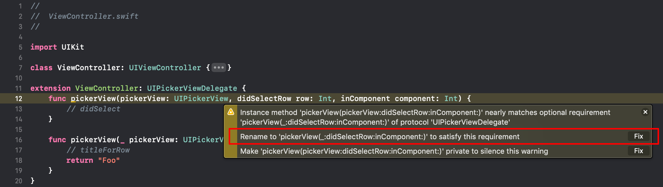 通常,如果您点击警告,它甚至会给您一个选项,让Xcode修复您的方法签名。选择“.”选项。为了满足这个要求“,而不是说”.若要使此警告保持沉默“: