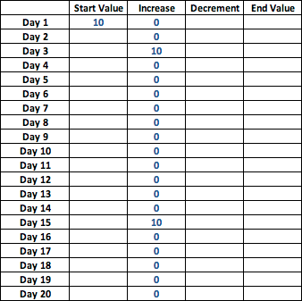 我只知道第一天的起始数,我的增加时间表,如果是正的还是负的,我的递减值。