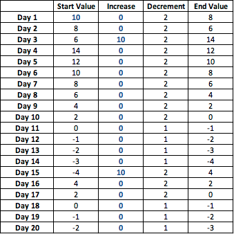 注意:,您有一个规定,如果start_val是正数(>= 0),则将递减设置为2,但是,在输出示例的Day 11中,将递减设置为1 where start_val + increase = 0。
