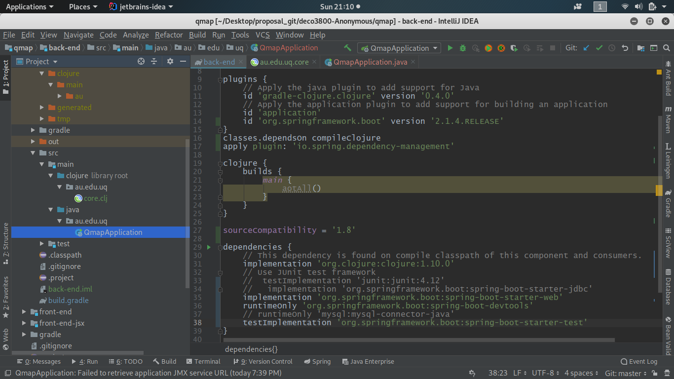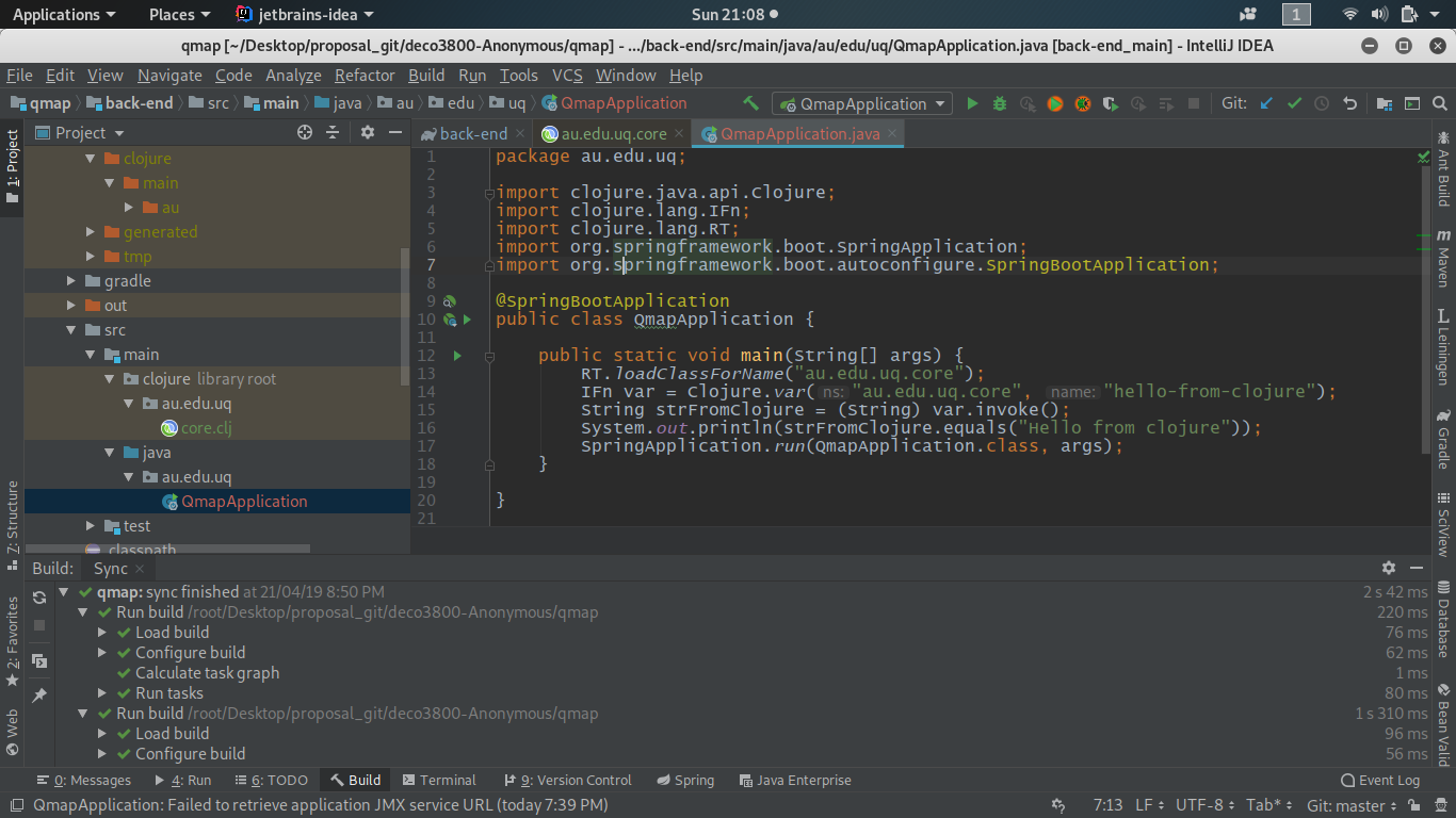 我目前正在尝试将clojure集成到gradle springboot项目中,尽管它工作正常,但在RT.loadClassForName("au.edu.uq.core");之前,我确实必须使用Clojure.var才能访问该函数,如果我对RT.loadClassForName("au.edu.uq.core");进行注释,就会出现如下错误: