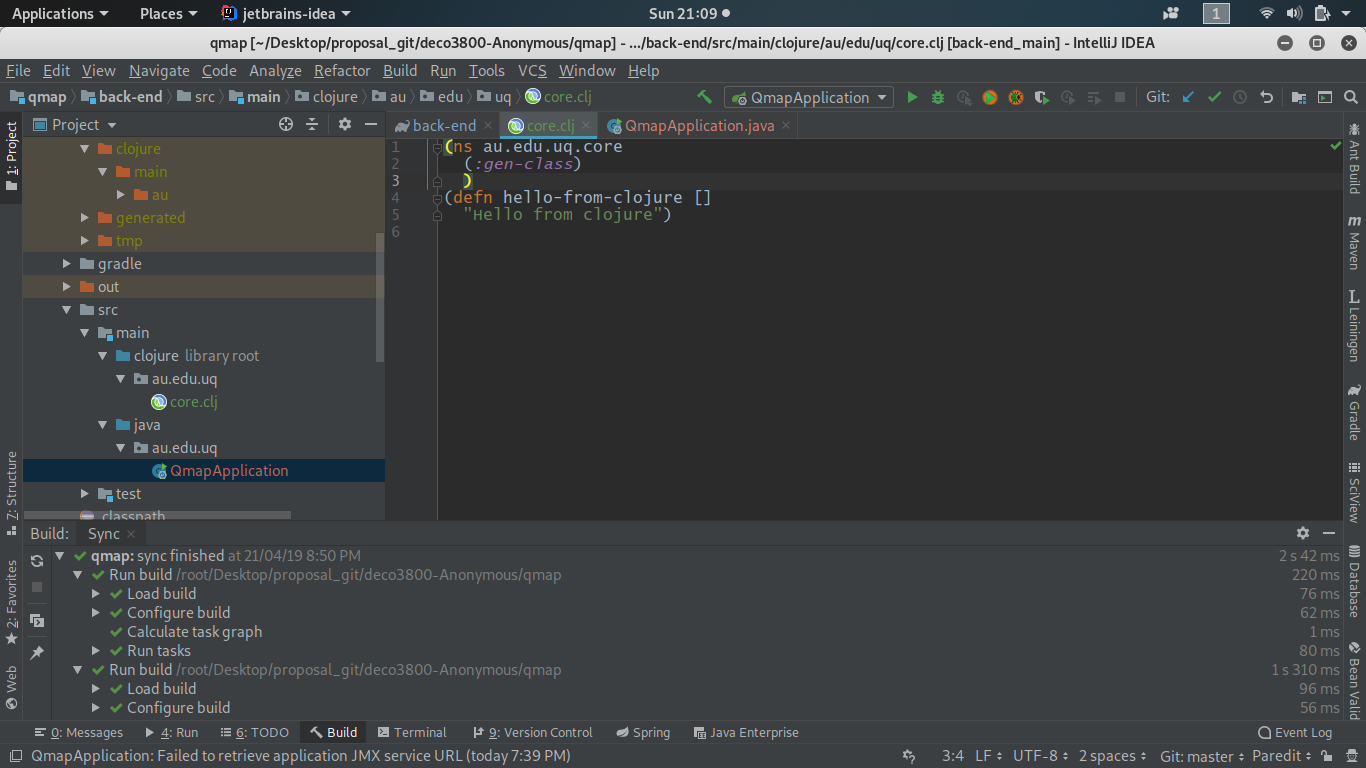 有build.gradle、主Java和clojure命名空间的屏幕截图。这是一个小小的演示项目,让我学习gradle,有什么建议可以让这个构建过程更优雅吗?