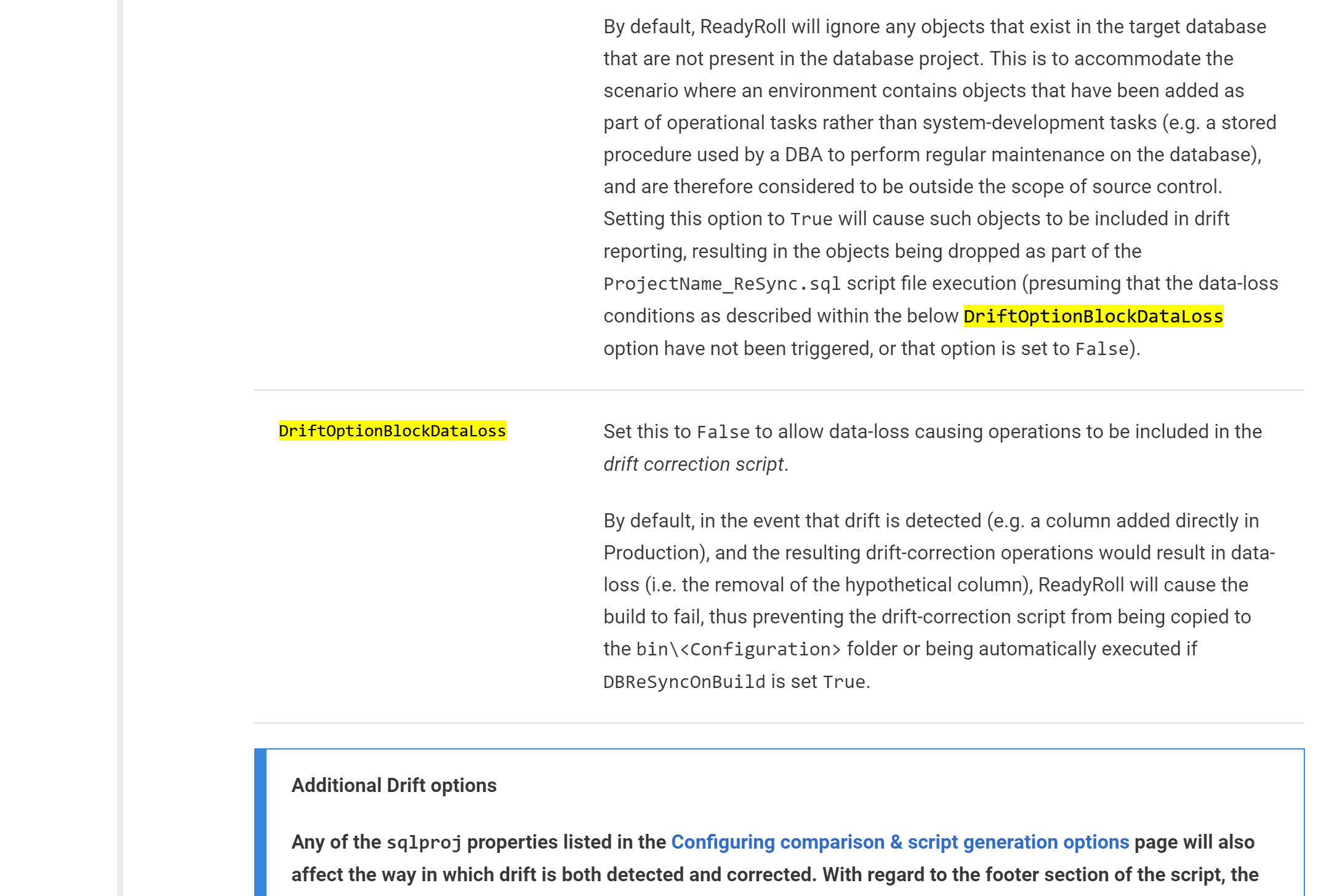我使用的是ReadyRoll核心,而不是Pro版本,因为这个功能是VSTS扩展的Pro版本的一部分。请参阅与ReadyRoll和Diff报告和diff正确的脚本相关的红门文档(第4节),其中此param DriftOptionBlockDataLoss和其他相关的params DriftOptionDropMissingObjects是在构建管道中建立的。