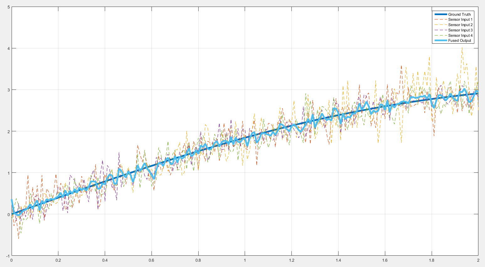 legend('Ground Truth', 'Sensor Input 1', 'Sensor Input 2', 'Sensor Input 3', 'Sensor Input 4', 'Fused Output');