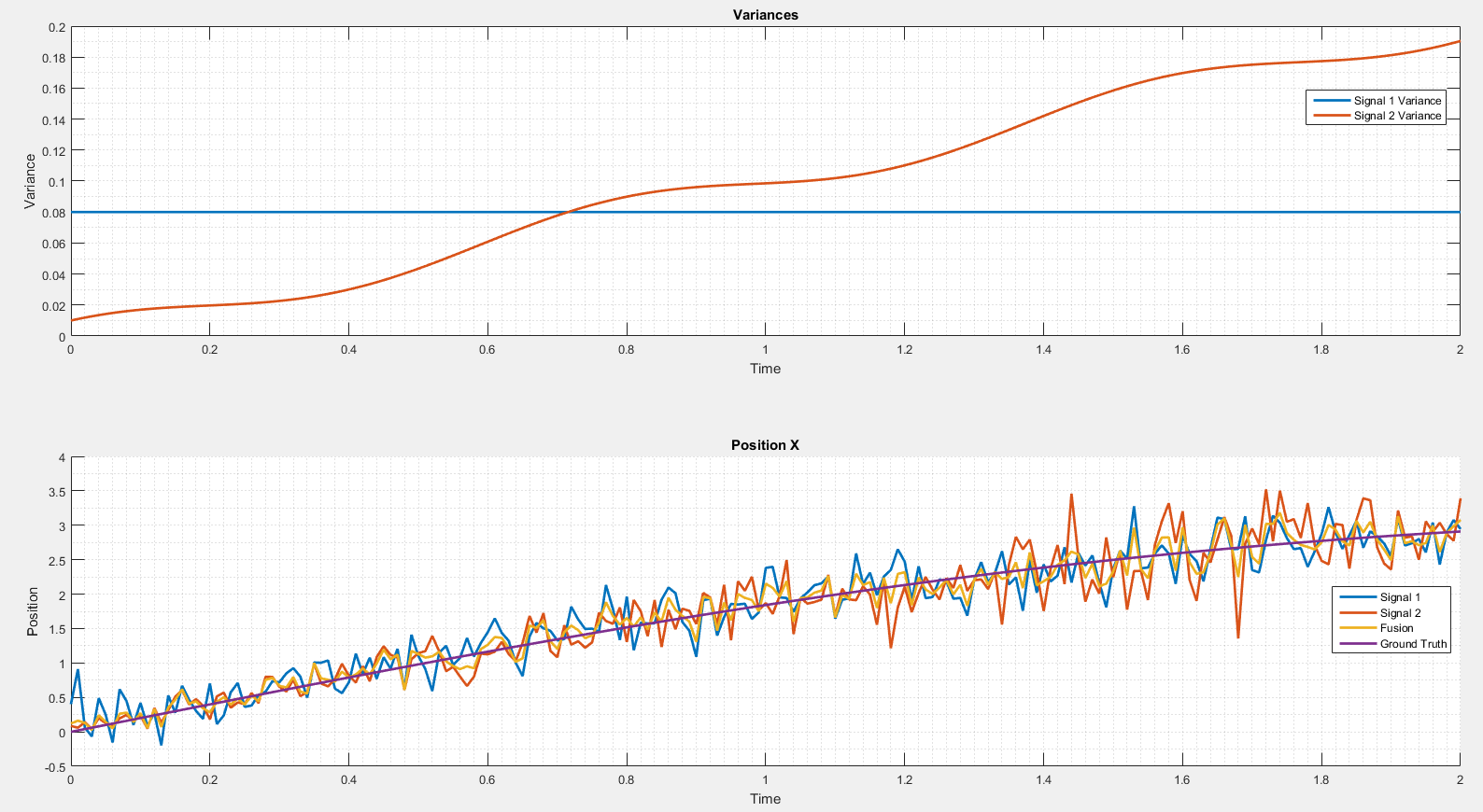 我模拟了两个信号。第二信号的方差随时间而变化。只要它小于第一个信号的方差,融合结果就接近第二个信号。当第二信号的方差太大时,情况就不是这样了。