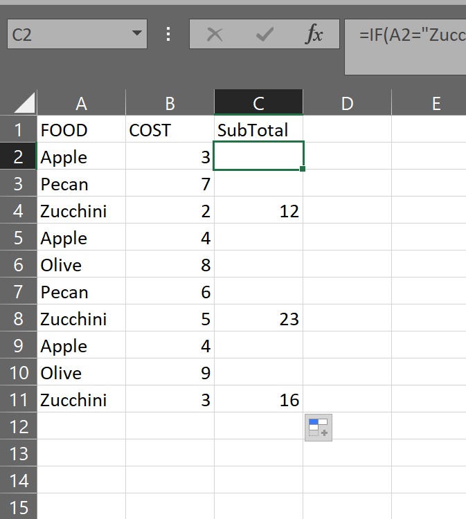 FOOD COST COUNTIF(A2:A$2;"Zucchini") SUMIF(C:C;C2;B:B)
